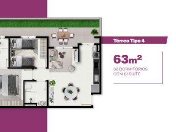 Também com 63m², esta opção oferece dois dormitórios e um amplo quintal privativo. É ideal para quem valoriza áreas externas sem abdicar do conforto interno.